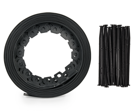 Kompletny zestaw do szybkiego wyznaczenia krawędzi rabat i trawnika: 10 metrów obrzeża oraz 20 kotew mocujących w zestawie – estetyczny kolor ciemny grafit.