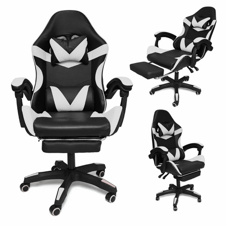 Fotel gamingowy w kolorystyce czarno-białej został zaprojektowany z myślą o długich sesjach przy biurku – zarówno w domu, jak i w biurze. Obicie z ekoskóry jest łatwe do utrzymania w czystości, a dodatki w postaci poduszki lędźwiowej i poduszki na zagłówek pomagają zadbać o komfort pleców i karku.
